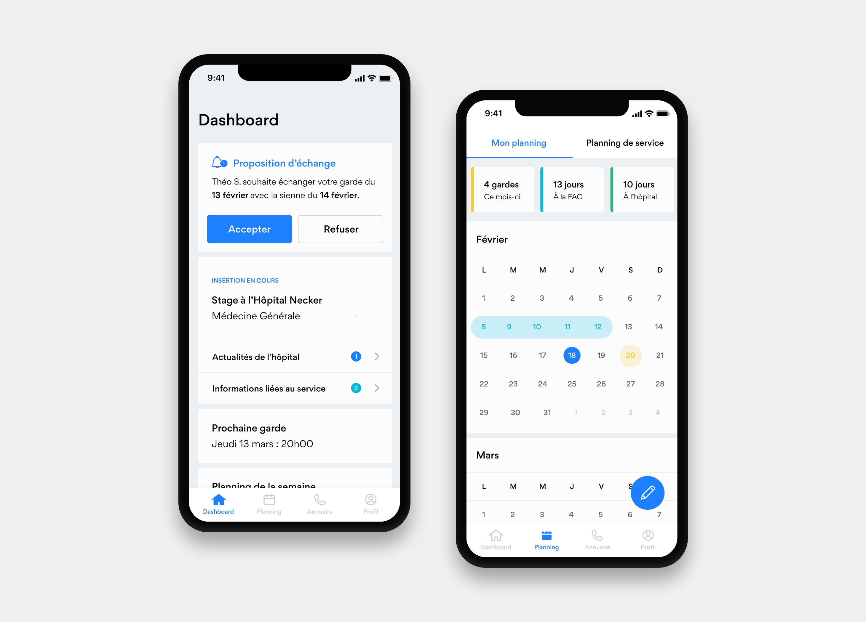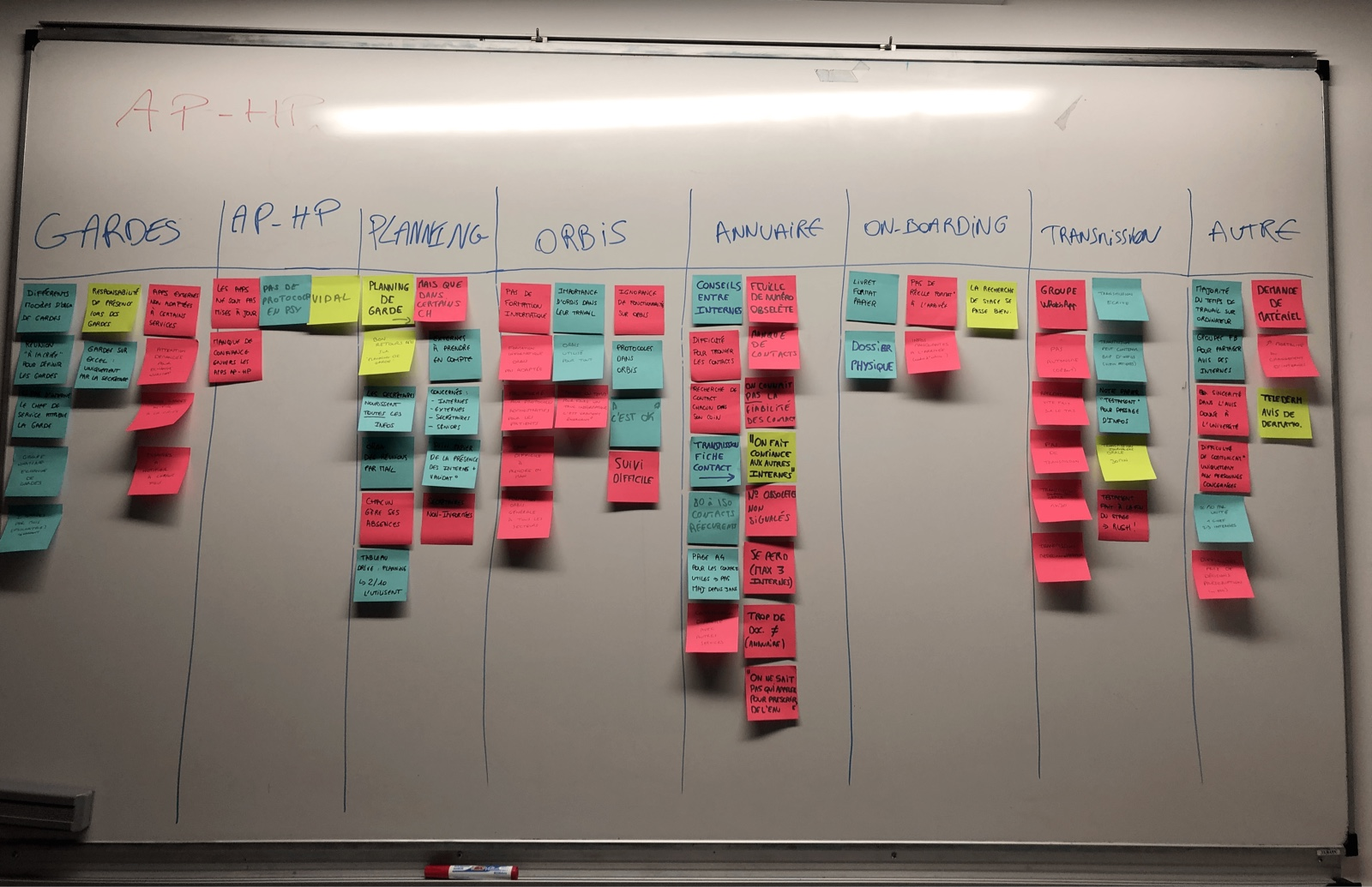 We conducted 20 interviews (14 in-person, 6 by phone) at Albert Chenevier Hospital in Créteil. Average interview duration: 20 minutes. We identified four key needs: finding contact numbers from other hospitals, better schedule overview, organizing duty schedules, and increasing belonging among Paris interns.